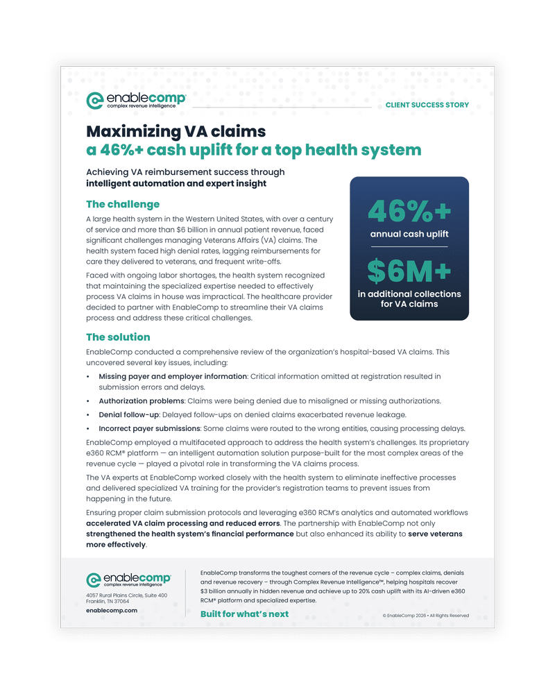 This success story highlights how a large health system partnered with EnableComp to overcome persistent challenges in managing Veterans Affairs (VA) claims. Through intelligent automation and expert guidance, the health system streamlined its processes, significantly improving reimbursement and strengthening its financial performance.